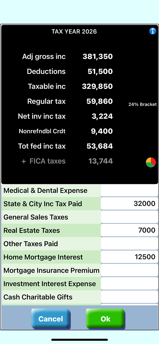 Tax related results are displayed as you enter each value. Summary input can be made be directly entering the value in the button's text window or you can enter itemized input on the detail input screen available upon clicking the a button.